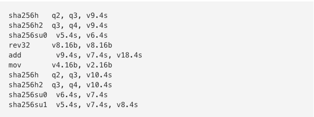 As part of the minio/sha256-simd repository we have added an arm64 Golang assembly version of which an excerpt is shown below (just one cycle of many cycles):