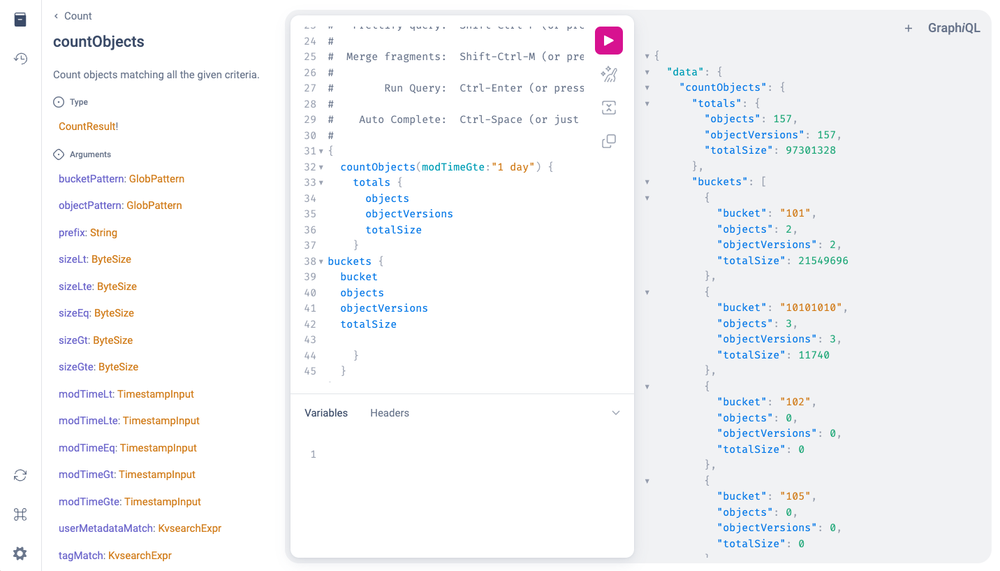 - Operational Automation: MinIO Catalog proves to be a cornerstone in operational automation, simplifying a range of routine tasks for users. From checking replication statuses to maintaining meticulous inventory control, the GraphQL interface empowers users to effortlessly navigate and manage their object storage environment. This not only enhances overall operational efficiency but also allows users to stay proactive in addressing any potential issues promptly. The Catalog's real-time, continuously updated information ensures that automated processes are executed with precision, contributing to a more streamlined and responsive operational workflow.