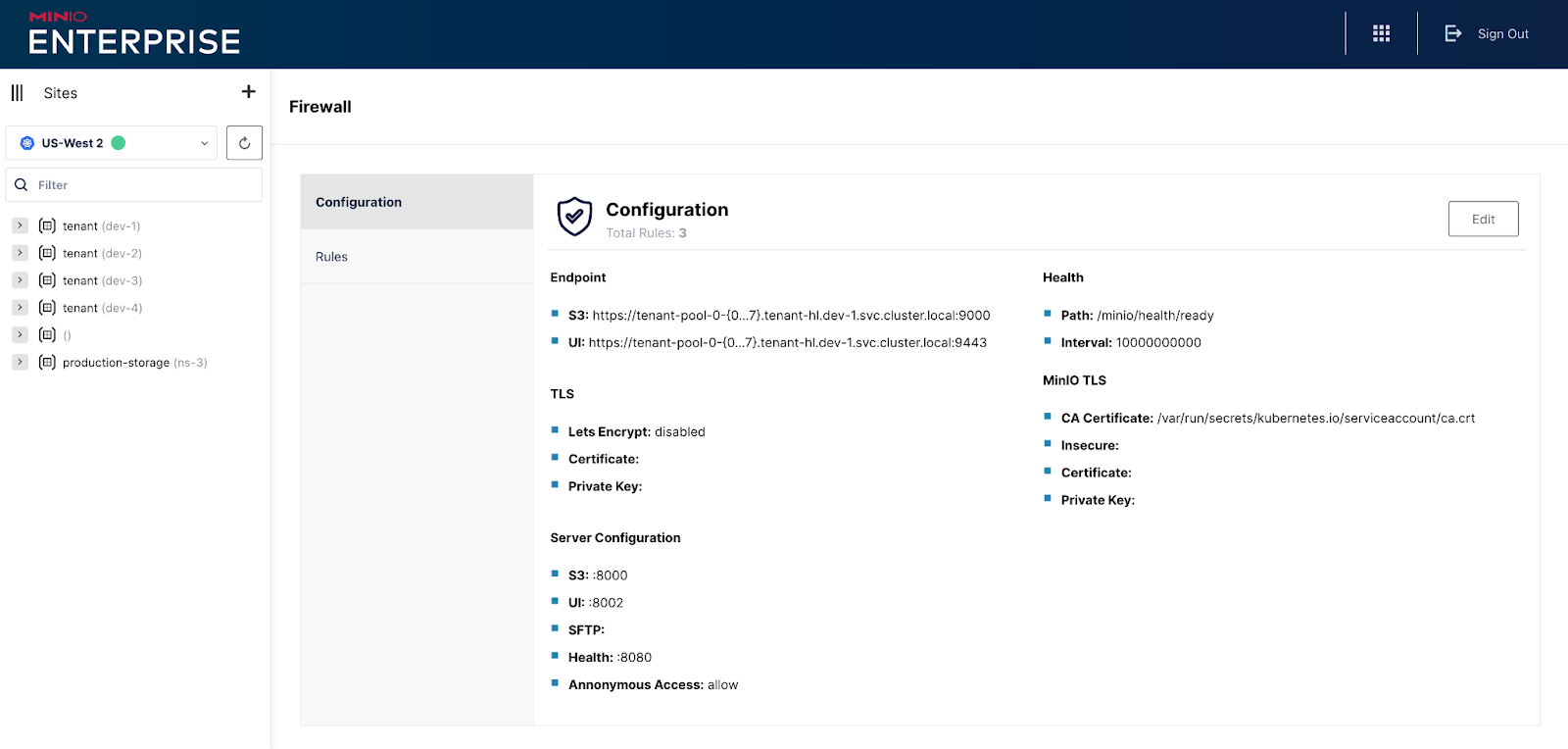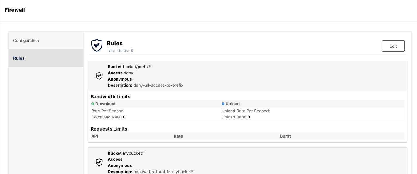 MinIO Firewall rules can be configured to apply to all buckets or specific object prefixes. Rules can be configured to allow or deny access to buckets, restrict bandwidth and request rate limits. Remember, the MinIO Object Storage Firewall is S3 API aware so there is remarkable flexibility in rule creation. One can even tighten IAM policies, but not loosen, since it operates at the data layer. This includes everything from DELETEs, the # of GET calls, how much, how often, how anonymous requests are dealt with, etc.