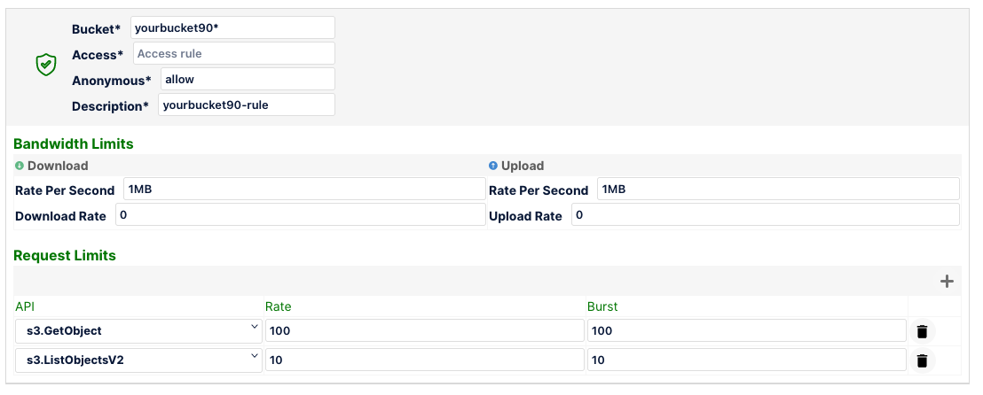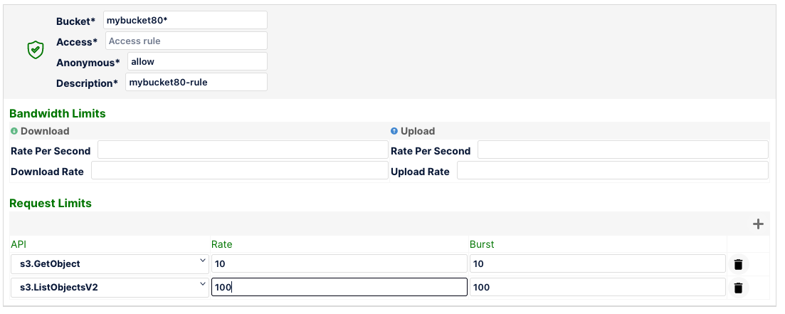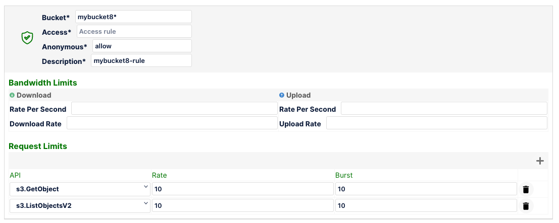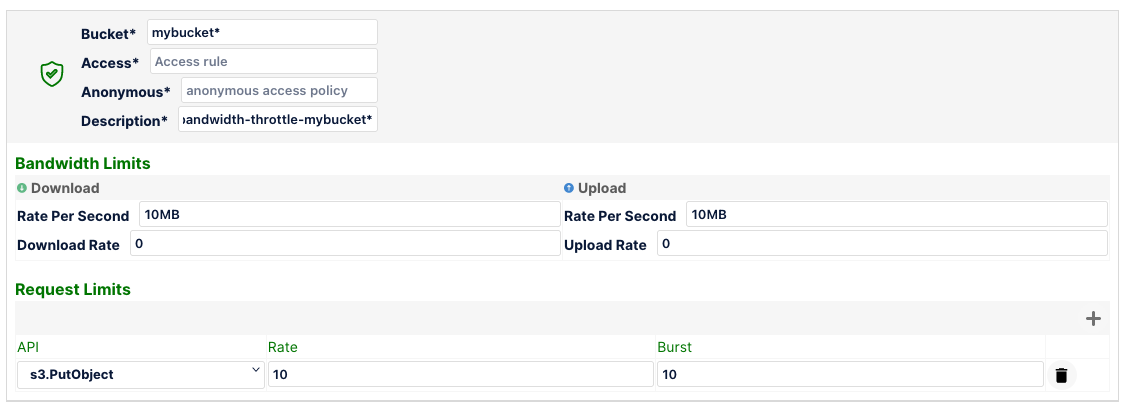 In the below example, for objects in bucket mybucket1, the download and upload rate is throttled at 10MB/s with requests to s3.PutObject capped at 10 requests/sec.