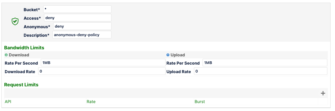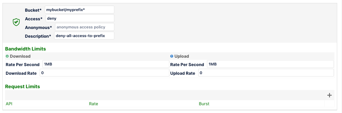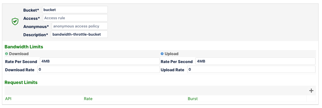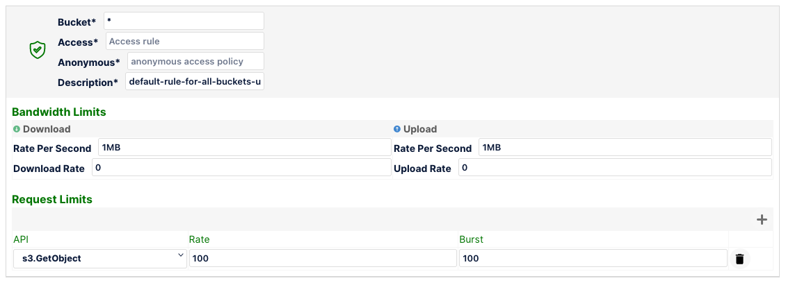 But the downloadRatePerSec and uploadRatePerSec will not apply to mybucket1 since the above rule takes precedence because it's more specific.