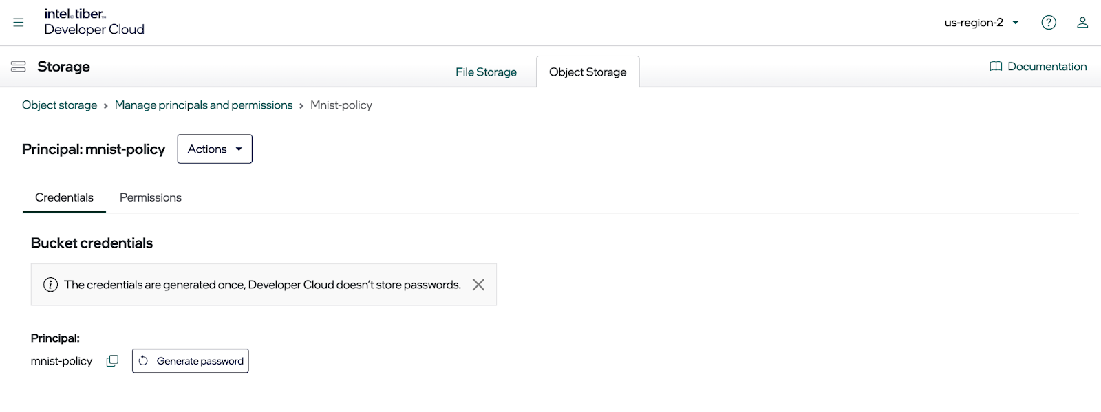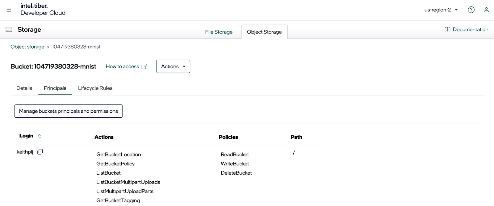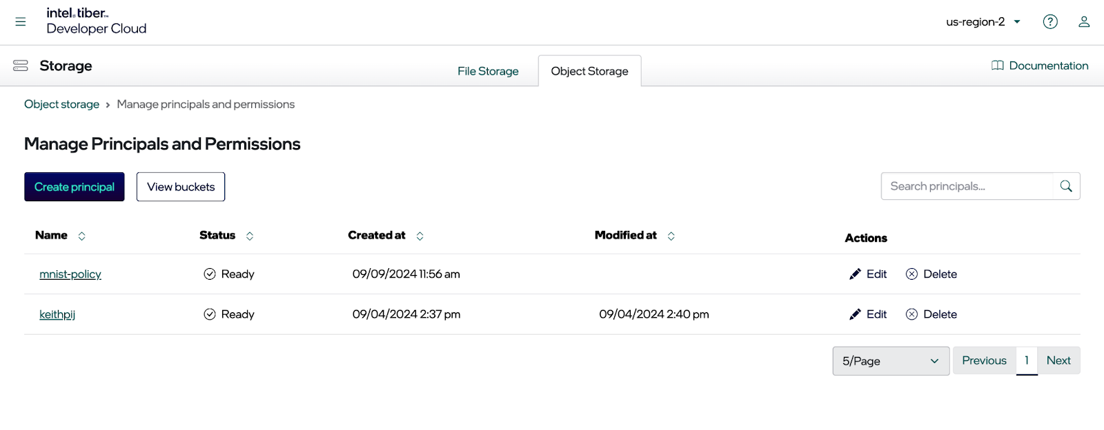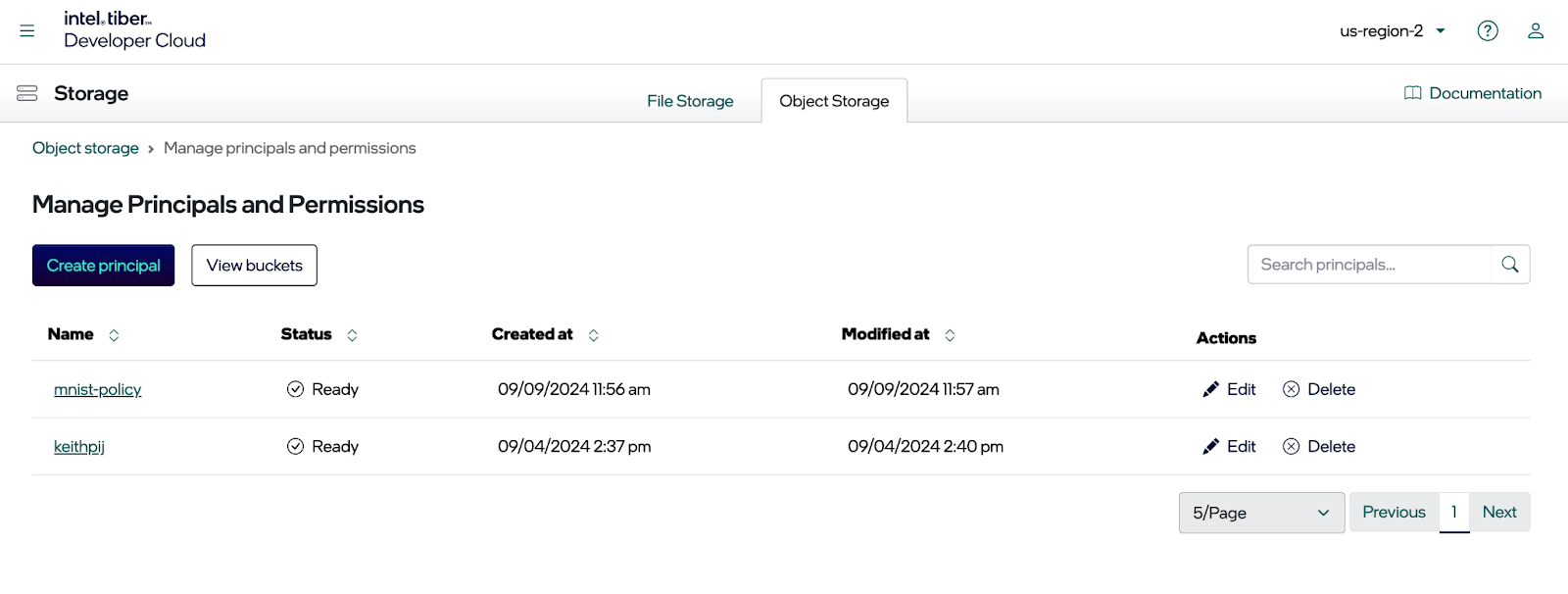 Since you need to access your bucket programmatically, create a principal and associate an access key and secret key with it. To do this, click on the Principles tab. All existing principles will show.