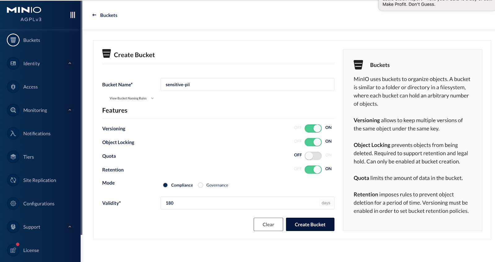The MinIO Console can be used for general administrative tasks like bucket creation, user creation, Identity and access management, etc. The example we are trying to implement from above, if the sensitive PII bucket needs to be created with object locking and specific time based retention then it can be implemented as follows: