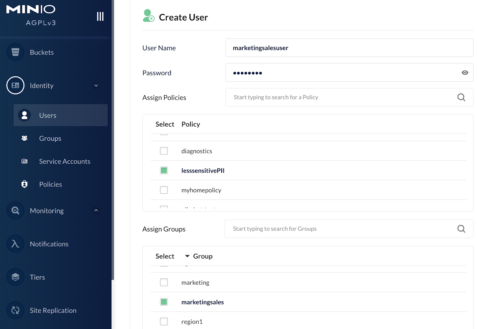 }When a user is created within MinIO, policies and groups can be defined at creation time such that the user inherits the appropriate property. For example, you can create a MarketingSales group user (in the screen shot below we have called this user marketingsalesuser; this name could be anything, for example in the architecture diagram we had called this user “MarketingSales User”) and assign the lesssensitivePII policy to this user as follows:
