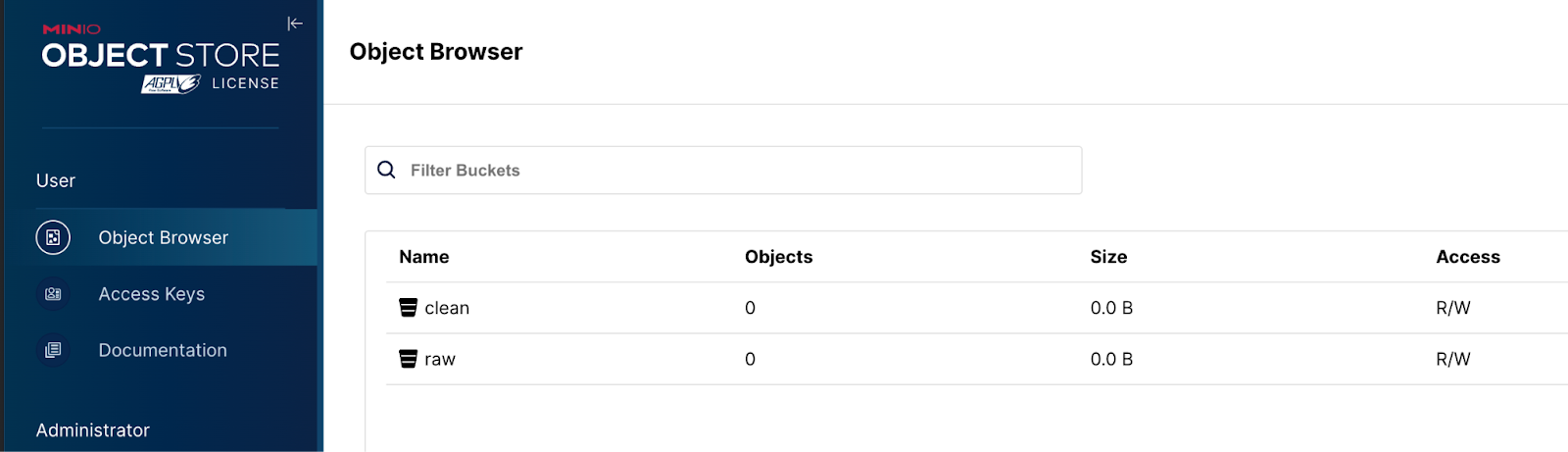Navigate to http://127.0.0.1:9001 to check to see that the raw and clean buckets have been successfully created.