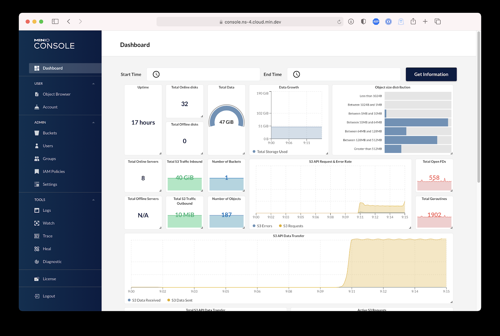 The MinIO Console provides the same power and simplicity of our mc CLI in an intuitive browser-based GUI that features a dashboard that visualizes industry standard monitoring via Prometheus and the MinIO metrics endpoint.