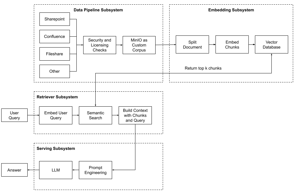 An embedding subsystem is one of four subsystems needed to implement Retrieval Augmented Generation. It turns your custom corpus into a database of vectors that can be searched for semantic meaning. The other subsystems are the data pipeline for creating your custom corpus, the retriever for querying the vector database to add more context to a user query, and finally, the serving subsystem that hosts your large language model (LLM) and will generate answers based on the user’s query and the context found in your vector database. The diagram below shows how these four subsystems work together during retrieval augmented generation.