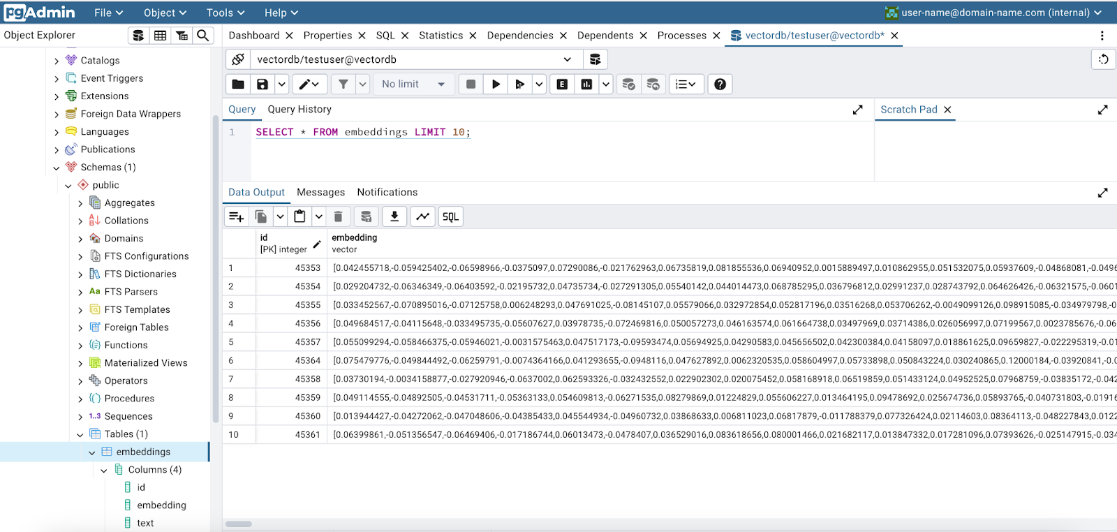 Below is a screenshot of pgAdmin that shows our newly created embeddings.