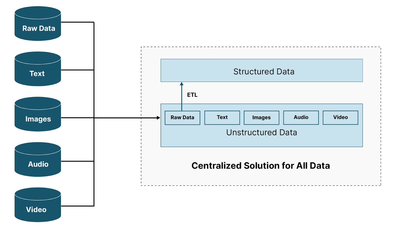 The diagram below depicts a common problem and a hypothetical solution. Data is coming into a data center from multiple locations and in multiple formats. What is needed is a centralized solution that allows raw data to be transformed such that a processing engine can efficiently support business intelligence, data analytics, and machine learning. At the same time, this solution must also be capable of storing unstructured data (text, images, audio, and video) for data exploration and machine learning. It should also keep any data that was transformed in its original format in case a transformation needs to be replayed or a data integrity issue needs to be investigated.