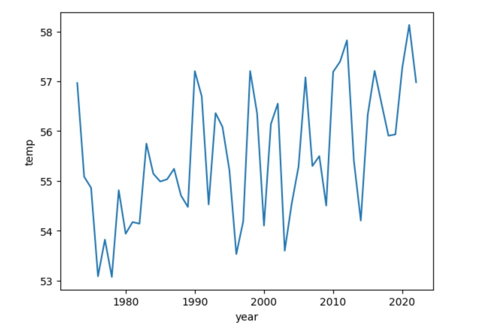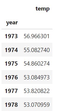 Next, we need to group by year and calculate the mean. Using Pandas, this is a few lines of code. No looping is needed.