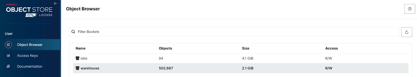 I used the MinIO console to ingest the raw data manually. In a professional pipeline, you will want to do this in an automated fashion. Check out How to Set up Kafka and Stream Data to MinIO in Kubernetes to see how to use Kafka and Kubernetes to get data into MinIO.