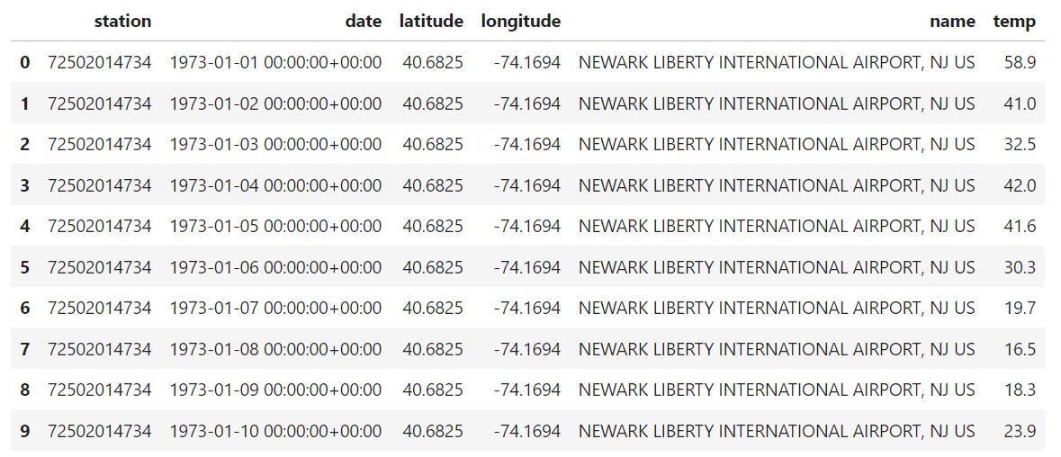 The station id used in the code above is for a station located at Newark Liberty International Airport, NJ, US. It has been operational since 1973 (almost 50 years of data). When the code runs, you will get the output below. (I am using the DataFrame head() function to get a sample.)