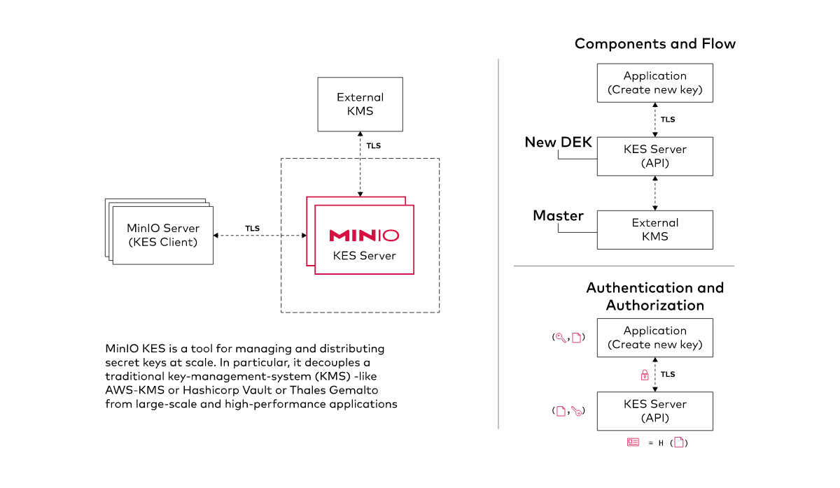While MinIO supports every major KMS, we also developed a native option for key encryption. MinIO’s Key Encryption Service (KES) is a stateless and distributed key-management system for high-performance applications. It is designed to be run inside Kubernetes and distribute cryptographic keys to applications. It is required for MinIO Server-Side Object Encryption (SSE-S3).