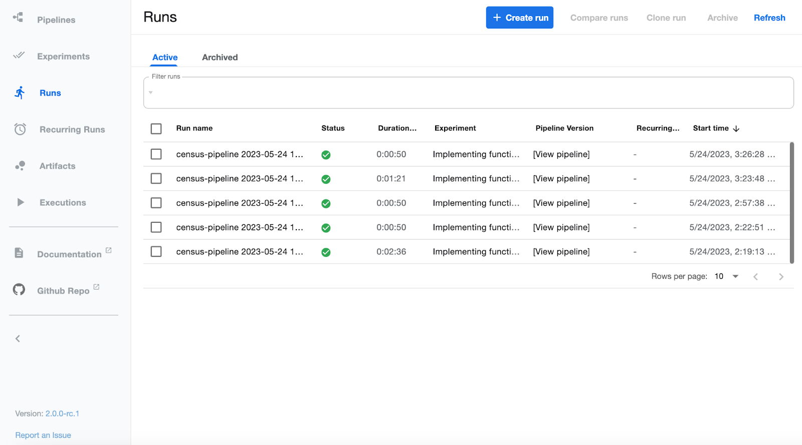 Choose a meaningful experiment name. The KFP UI has an experiments tab that will group runs with the same experiment name. The code above “compiles” your pipeline and components - which is merely the act of putting everything into a YAML file (including your source code). If you have any type mismatches that I described earlier, then you will find out about these problems while creating the run. This code will also send your pipeline to KFP and run it. Below is a screenshot showing a few successful runs of our pipeline.