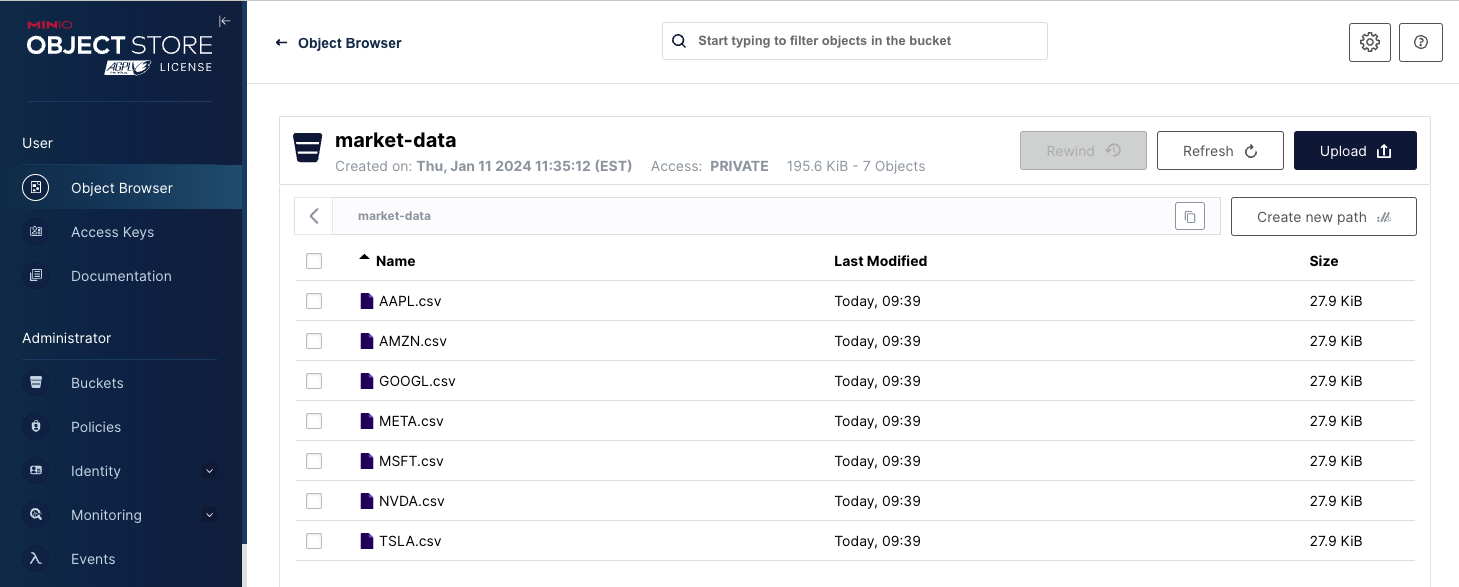Once the code above completes your MinIO bucket will look like the screenshot below.