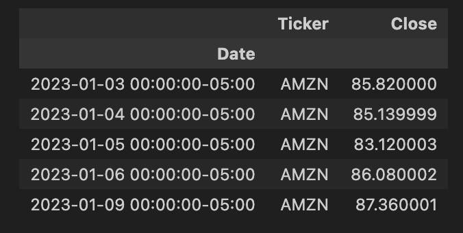 Let’s have one last bit of fun before wrapping up. What I want to do now is pull all our market data from MinIO and load it into one DataFrame. This is done below using Panda’s concat function. Notice that I also have to add a ticker column.