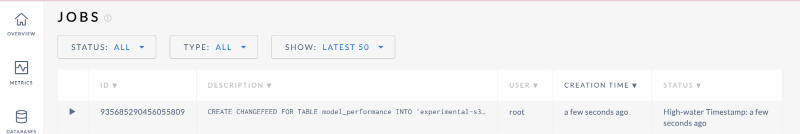 CREATE CHANGEFEED FOR TABLE model_performance INTO 'experimental-s3://cockroach?AWS_ACCESS_KEY_ID=minioadmin&AWS_SECRET_ACCESS_KEY=minioadmin&AWS_ENDPOINT=http://minio:9000&AWS_REGION=us-east-1' with updated, resolved='10s';Navigate to the Cockroach UI at http://127.0.0.1:8080 to verify that your changefeed has been successfully created and a high-water timestamp has been established.