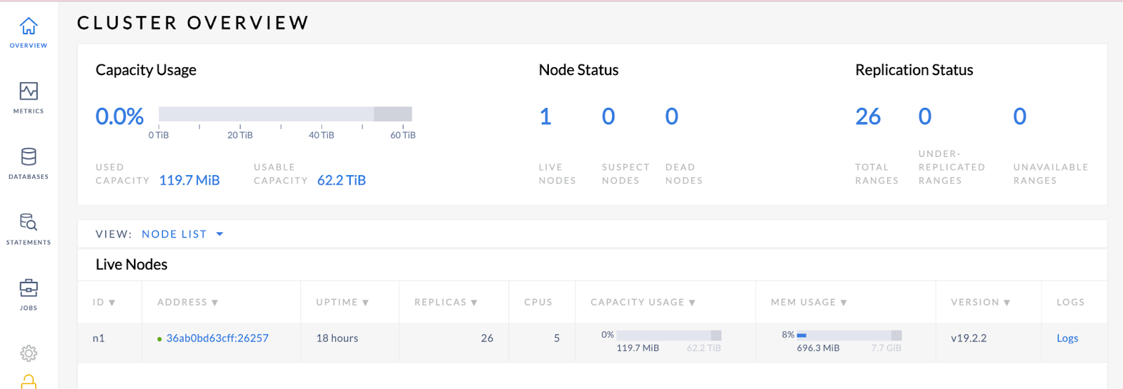 You can access the Cockroach UI at http://127.0.0.1:8080. Verify that your node is live.