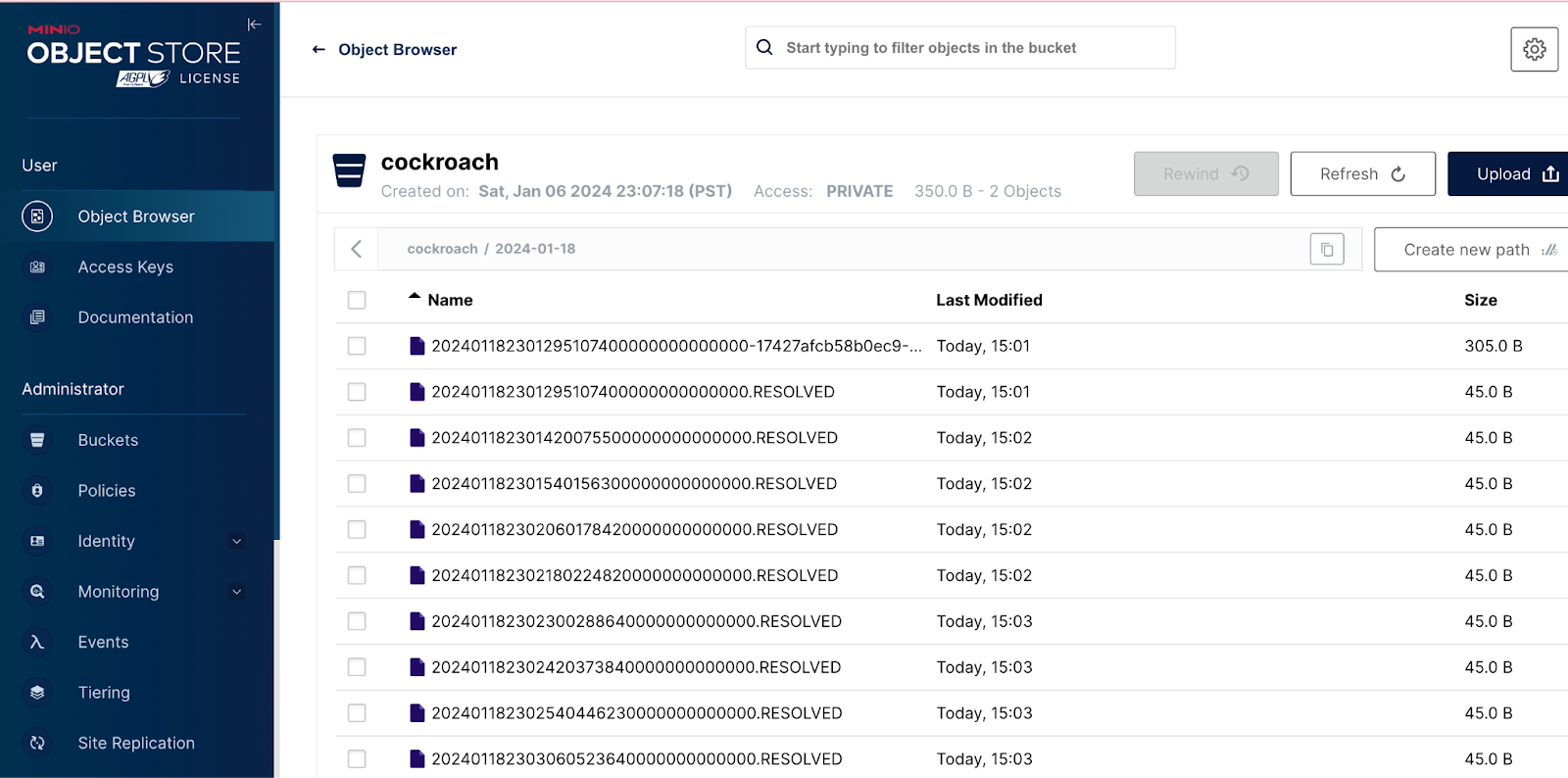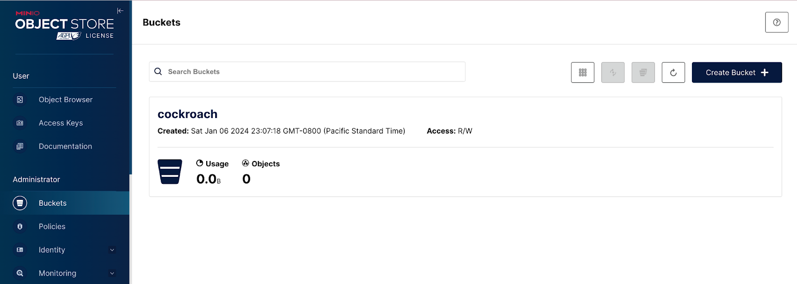 Once you log in, you should be able to verify that the mc command in the docker-compose.yml was executed and a bucket named cockroach was automatically created.
