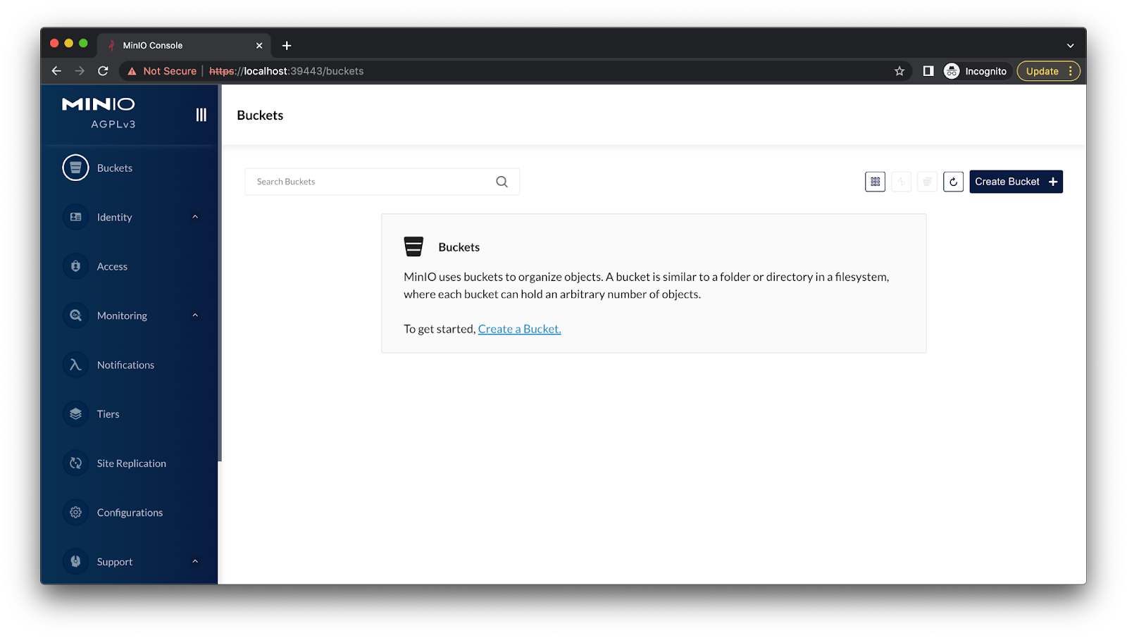 Verify MinIO is up and running. You can get the port of the MinIO console, in this case 9443.