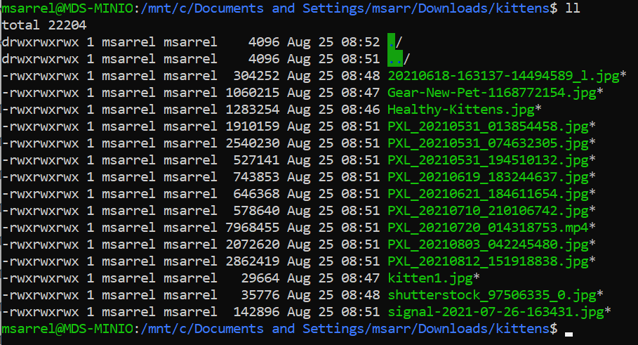 I’m going to start with a directory of files on my local machine. Please note that I run Windows 10 and Ubuntu 20.04 on Windows Subsystem for Linux 2. These are just a few photos of kittens that I’m using as an example. You don’t have to use kitten photos, feel free to substitute files that are more relevant to your use case, like product photos for an ecommerce catalog or log data from network devices. It’s all objects to MinIO.