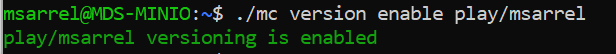 Enable versioning by entering ./mc version enable play/msarrel and I can see versioning has been turned on: