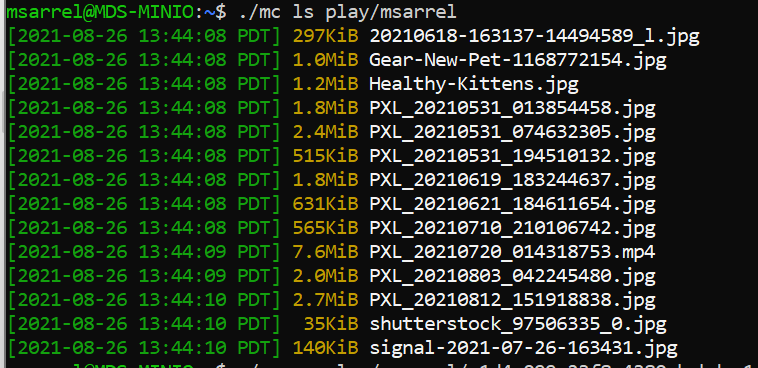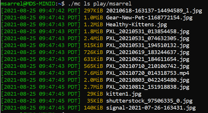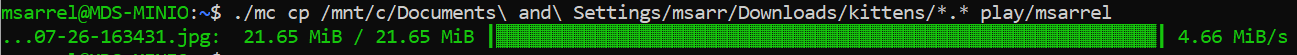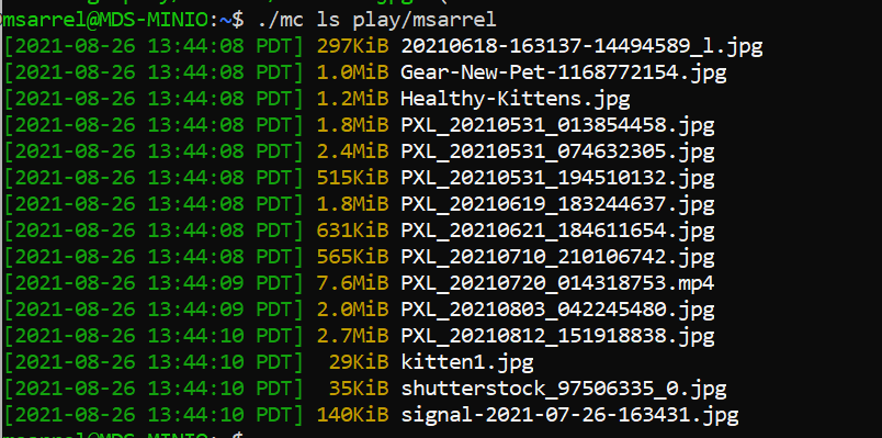 Now I’ll copy my kitten photos to the versioned bucket on play with ./mc cp /mnt/c/Documents\ and\ Settings/msarr/Downloads/kittens/*.* play/msarrel and I can see the files are copied to my bucket on play: