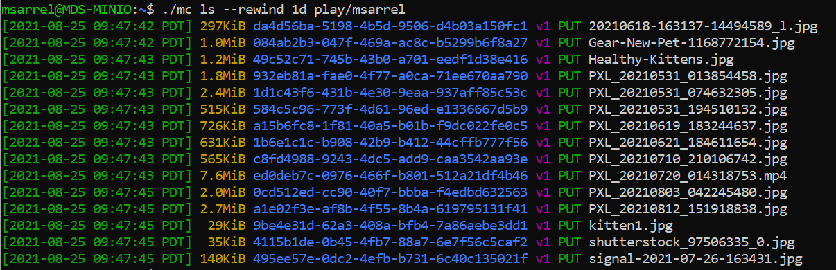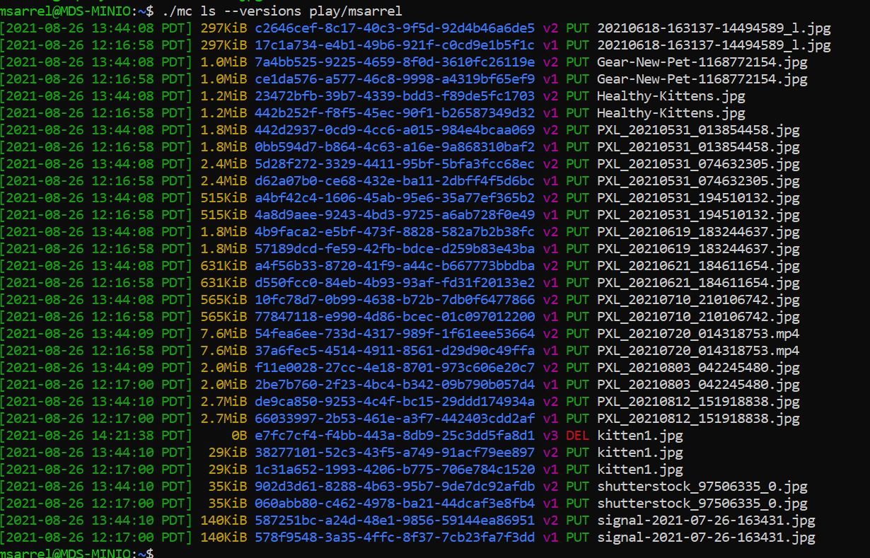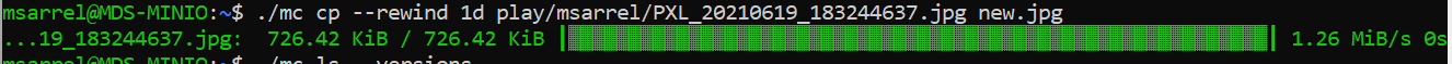 The modified version of the object has replaced the original, yet the original version remains. I can see when I enter the command ./mc ls --versions play/msarrel that there are two versions of the object PXL_2021_0619_183244637.jpg. There is a v1 created at the same time as the other objects and a v2 created about an hour later. You can also see that each object version has its own unique identifier making it possible to work with specific object versions directly.