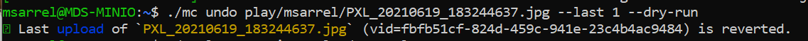 I can run ./mc undo play/msarrel/PXL_20210619_183244637.jpg --last 1 to revert the most recent PUT operation on my object. If I’m not certain that’s what I want to do, then I can also add the --dry-run flag to see what happens to the object: