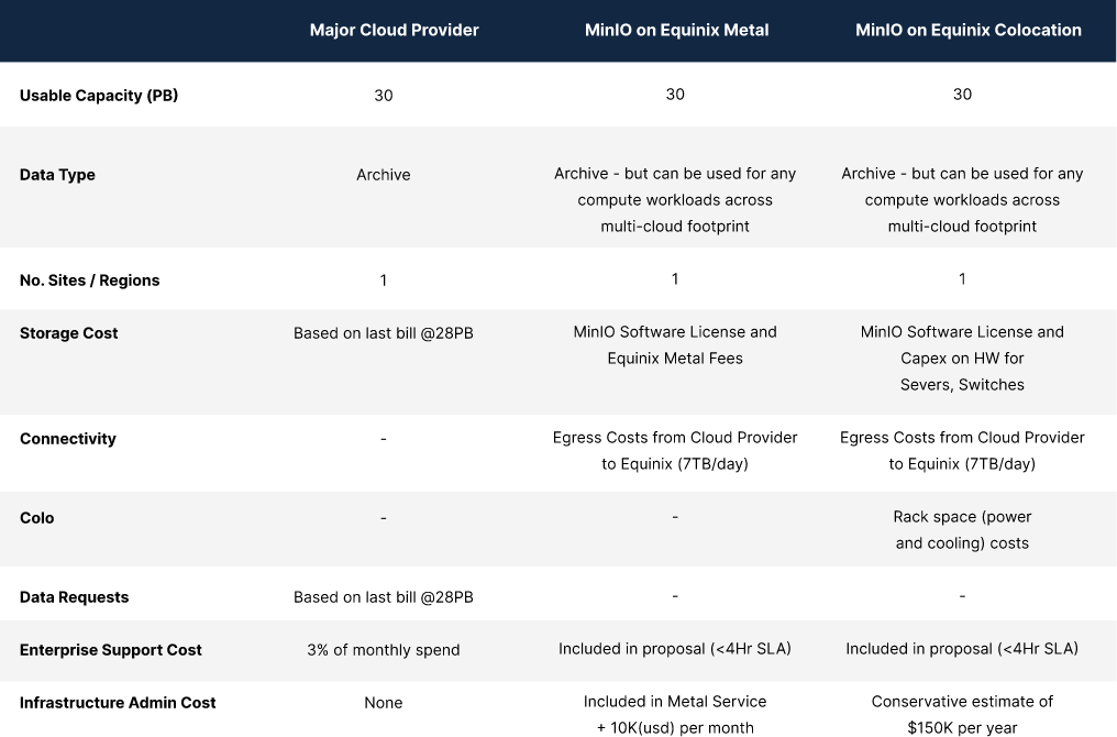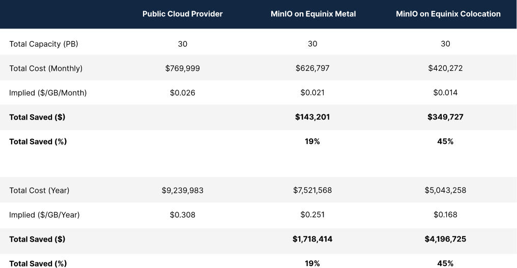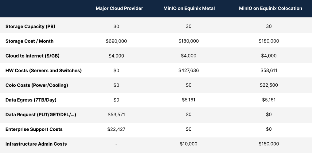 When we plug in the numbers on this based on the customer’s previous bill and Equinix and MinIO’s transparent pricing (using very conservative estimates), it starts to take shape.