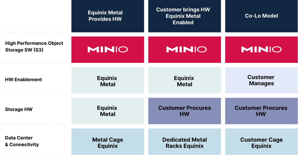 - Equinix Colocation - Like any colocation service, this option involves buying, building, and managing your own hardware. So, you’d deploy MinIO to your server, either in a container or on bare metal, and then deploy that server setup to one or more Equinix data centers. This route is available at any Equinix data center around the world and provides the highest total cost savings when compared to the public cloud.