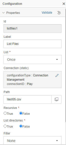 Open the configuration of List Files (the top circle to the right of the Operator), set List to Once, then choose the connector you built to MinIO and configure the Path for your file path. You can Validate the configuration and then save it.