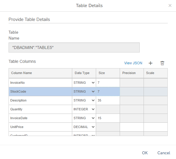 - For Table initialization, choose "Create" to create the table in SAP HANA.