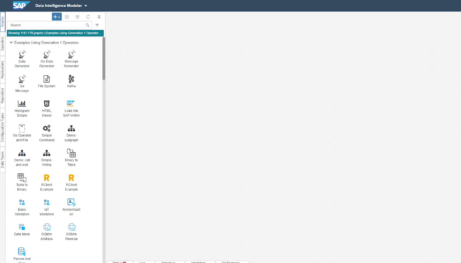 Navigate back to the SAP Data Intelligence Launchpad and click on the Modeler tile. You see a workspace in front of you into which we'll drag and drop Operators from the menu on the left and then link and configure them.