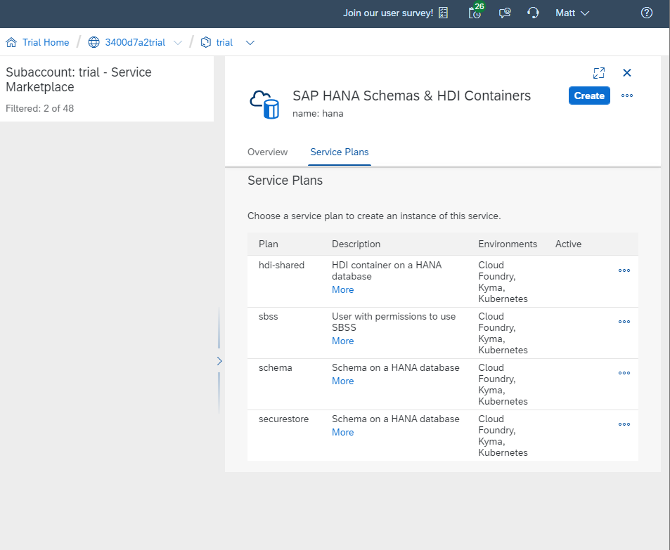 Open SAP BTP Cockpit and navigate to your subaccount, then choose Services, then Service Marketplace. Choose SAP HANA Schemas & HDI Containers (please note that trial users must choose SAP HANA Schemas & HDI Containers - Trial), then click the blue Create button.