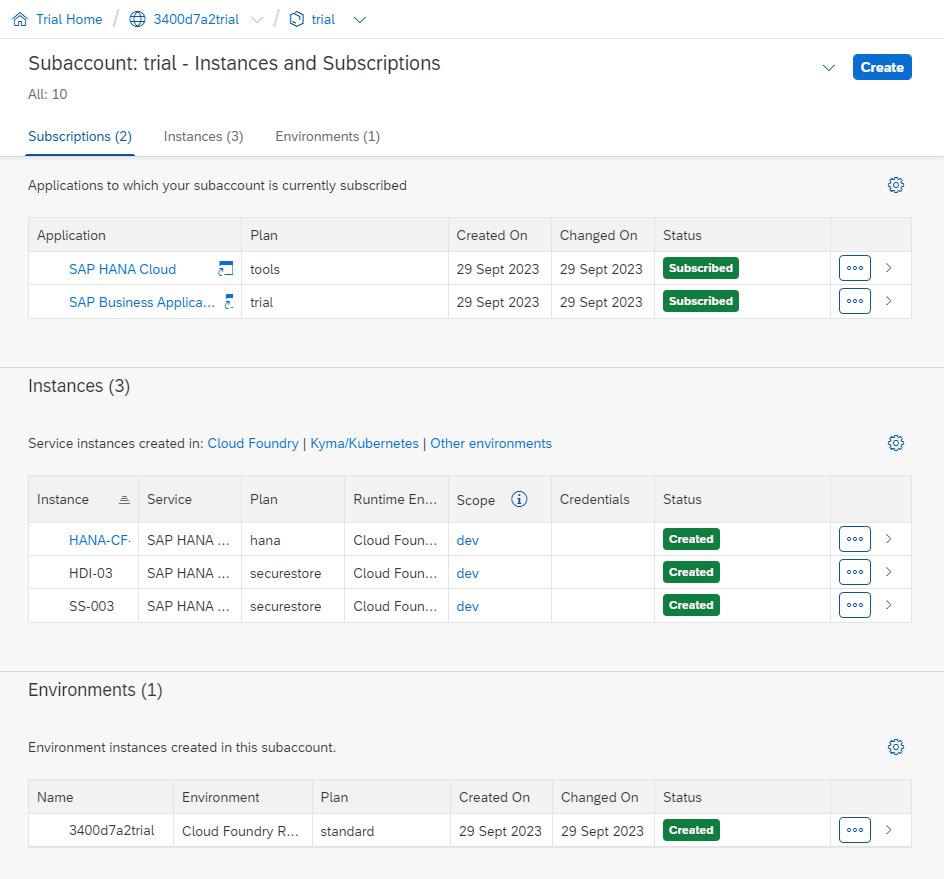 After these service instances are created, they will appear in the BTP Cockpit under Services > Instances and Subscriptions. You should see green boxes that say Created for each instance, providing you with a warm feeling of accomplishment.