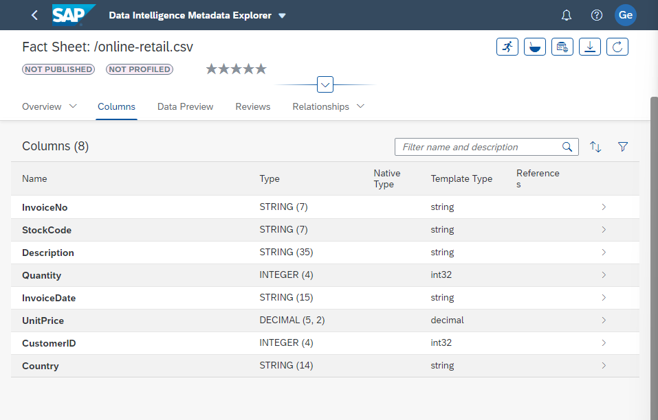 To configure table columns, clicking the browse icon will open the Table Details window where you can enter column names and data types. You can return to the SAP Data Intelligence Metadata Explorer and open a Fact Sheet on the file you're importing. Then click on Columns and now you can enter these names and types into the Table Details window.