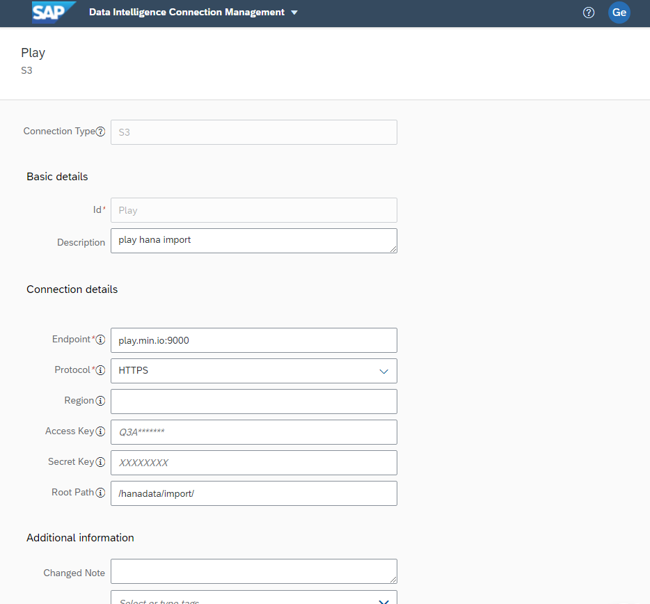 If you do not already have MinIO installed, please do so. Make sure to note the API endpoint address, access key, secret key and bucket/path because you'll need to enter them when you create a connection in SAP Data Intelligence.