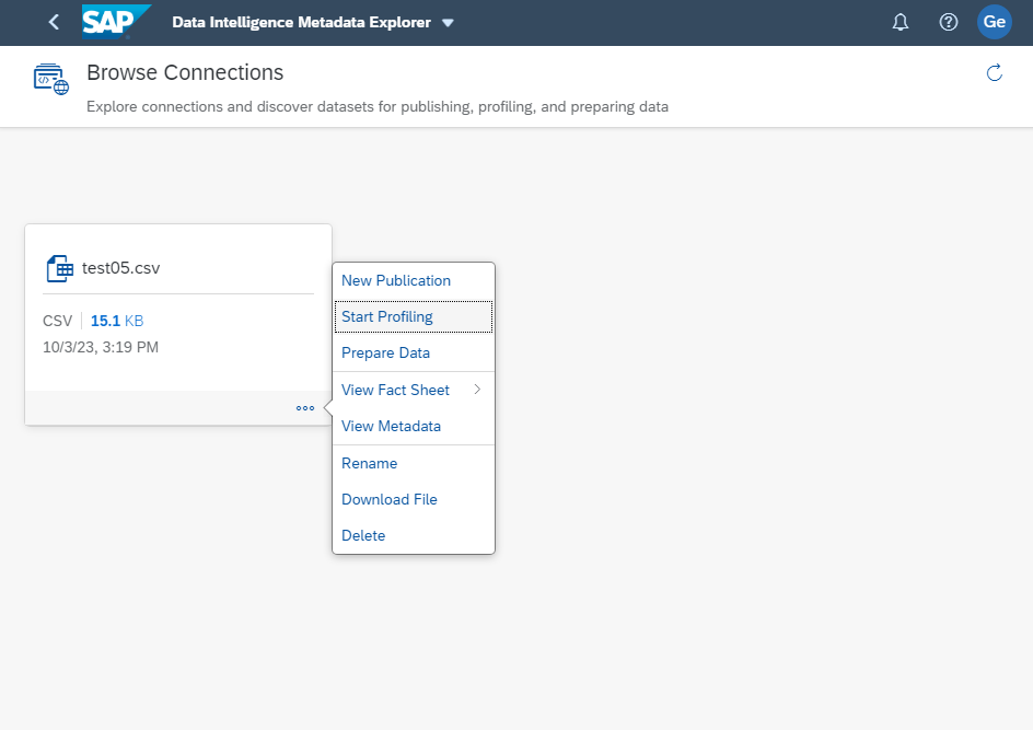 Let's verify that the connection is in order. Return to the SAP Data Intelligence Launchpad and click the Metadata Explorer tile, then click Browse Connections. Scroll to or search for the connection you just created, in my example I have used "Play". Click on your MinIO Connection. You will see all of the files saved in your MinIO bucket. Select the file you wish to import, click the three dots at the bottom right of the tile and select View Fact Sheet to see detailed information about the data it contains. You can also start data profiling, preparing and publishing data. Pretty cool stuff, and super easy to connect to MinIO.