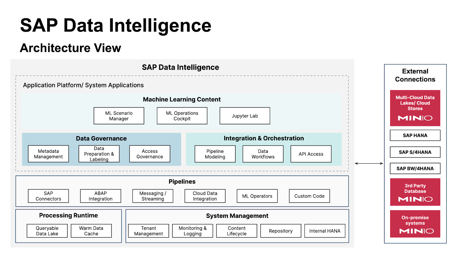 SAP HANA’s in-memory, multi-modal data management engine takes full advantage of the capabilities of underlying hardware, similar to the way MinIO also takes full advantage of underlying hardware, making it a powerful extension to the SAP HANA ecosystem. SAP Data Intelligence Cloud is a cloud-based distributed data management solution. It is the data orchestration layer of the SAP Business Technology Platform.
