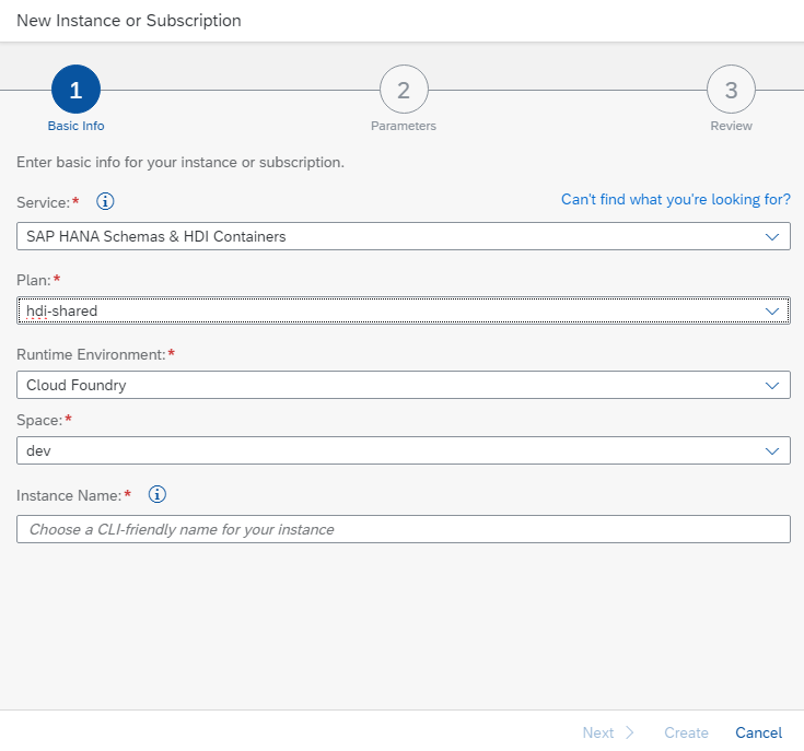 Choose a service plan from the dropdown and then enter a name for it. You'll do this first with Schema and then with HDI-Shared.