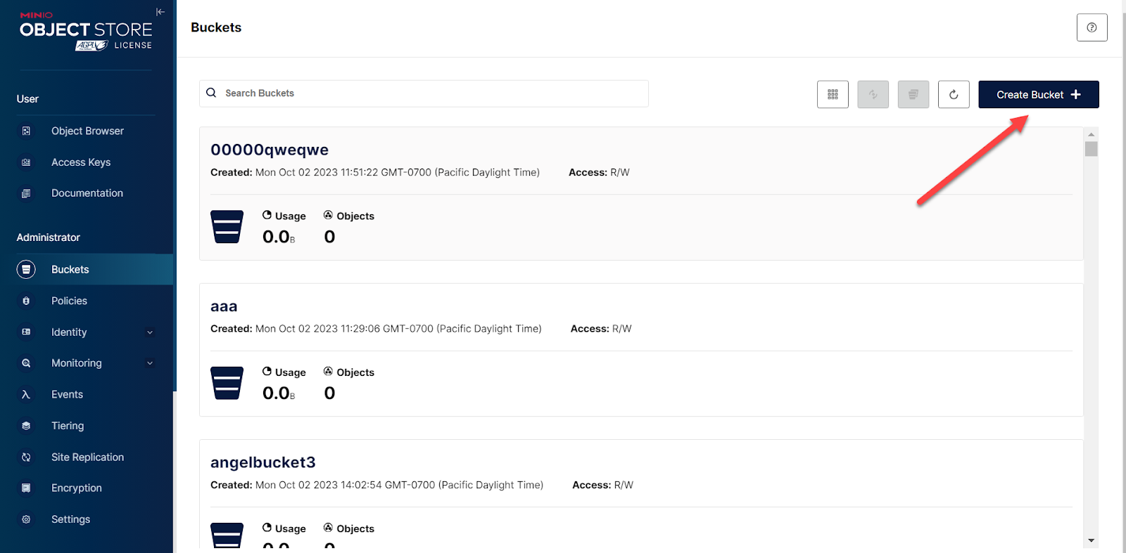 In a browser, log in to the MinIO Console, navigate to the Buckets tab and click Create Bucket +.