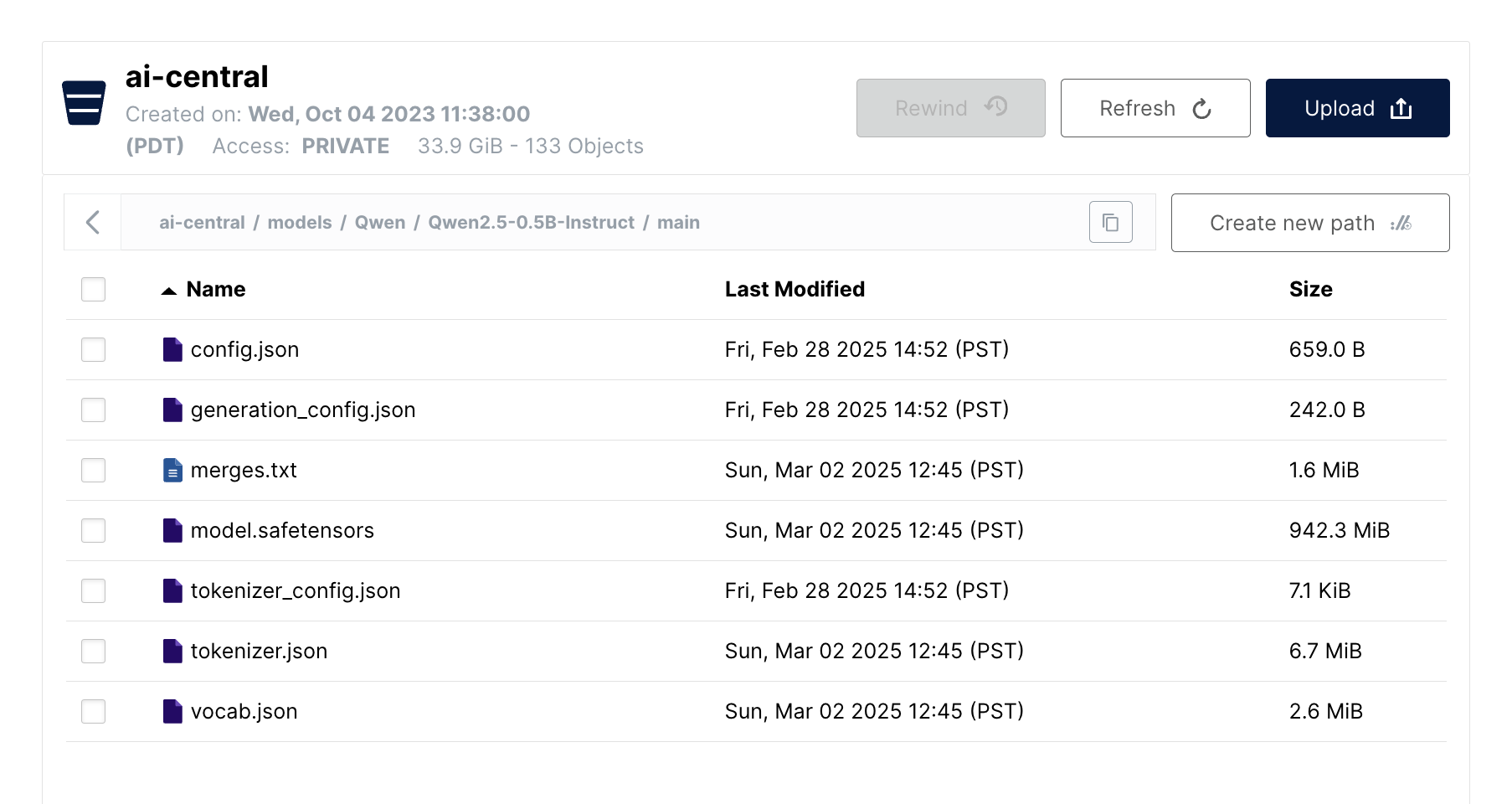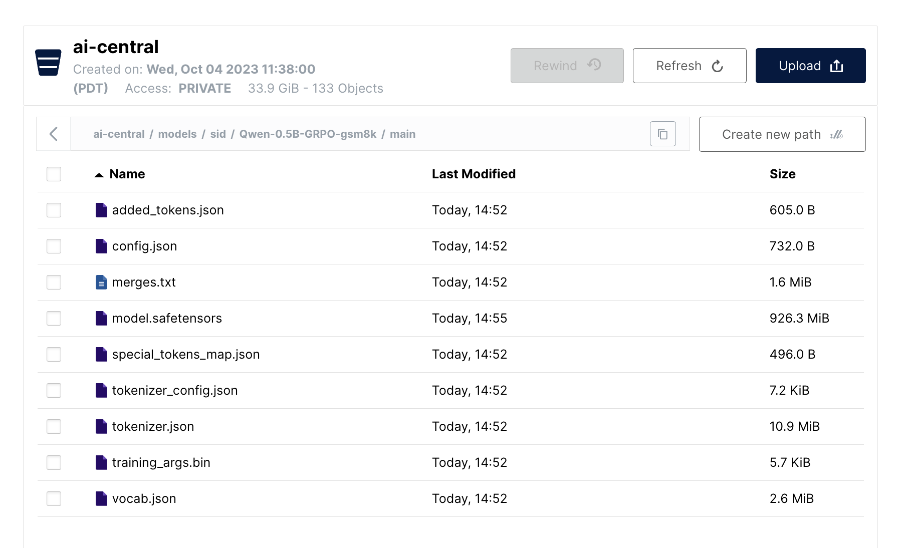 The RL routine has concluded. Since HF_ENDPOINT pointed to your AIHub, this ensured that the new model repository is created on AIStor and that the new checkpoint's files are pushed there. Let's verify it by checking the bucket ("ai-central")that AIHub is on top of, under the prefix corresponding to this new model ("models/sid/Qwen-0.5B-GRPO-gsm8k/main"):