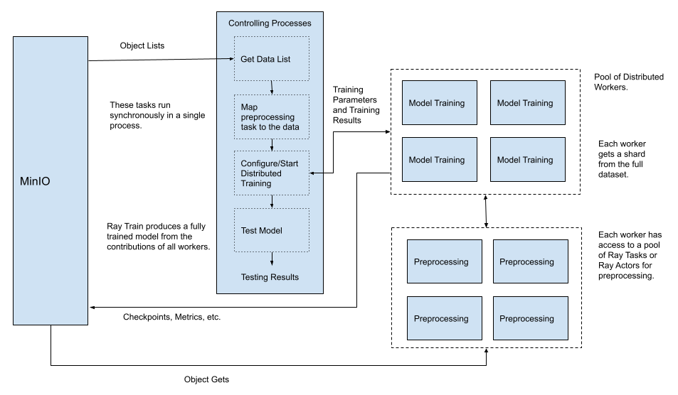 The diagram above may look odd as the tasks (or actors) used for preprocessing are called from the workers responsible for distributed training. However, remember my brief description above - preprocessing tasks are mapped to datasets and the tasks are invoked as we iterate over the dataset from within our training loop.