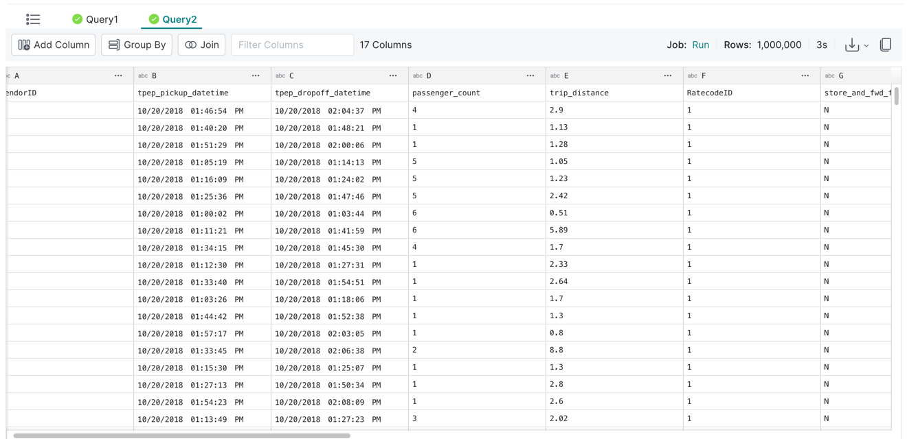 SELECT * FROM nyc_taxi_small;Paste the above in the console and click Run, then you see something like below