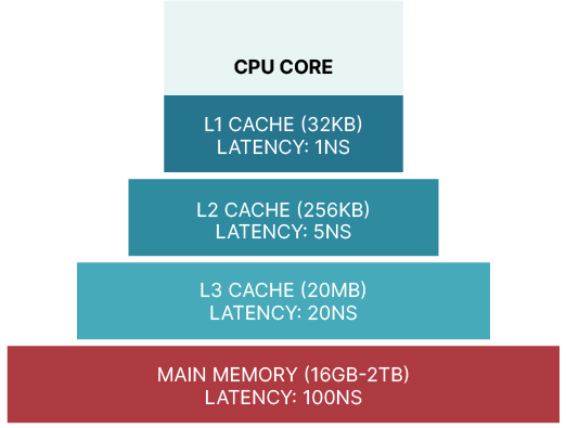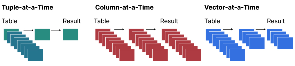 - Vector-at-a-time: Used by DuckDB, this approach finds a middle ground between the two other models. Queries are processed in batches of data consisting of collections of vectors which each contain a fixed amount of values from the columns. This model delays the materialization of values from multiple columns into tuples (or rows) until the very end of the query plan. The result is an efficient use of in-cache operations, by keeping the data in queries as much as possible in the very fast L1 and L2 Cache (see image below).