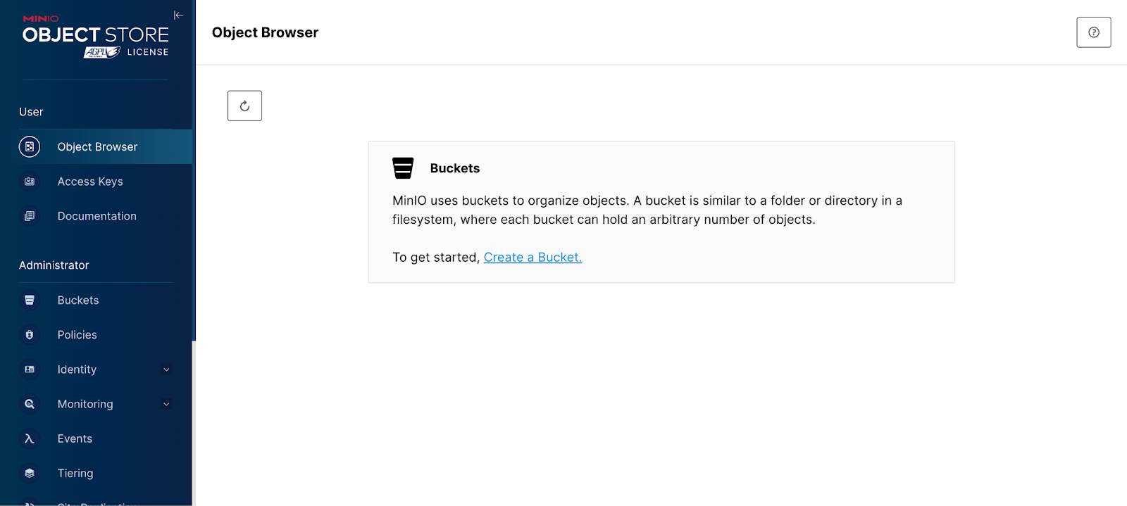 quay.io/minio/minio server /data --console-address ":9090"To set up MinIO for production, refer to the Deploy MinIO: Multi-Node Multi-Drive guide. When you navigate to the MinIO Console, you’ll be prompted to create a bucket.