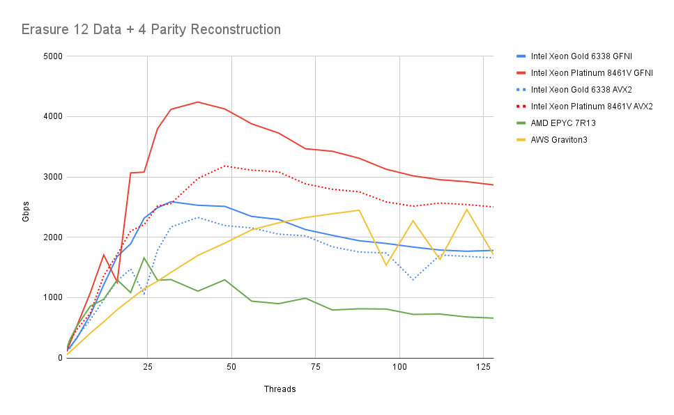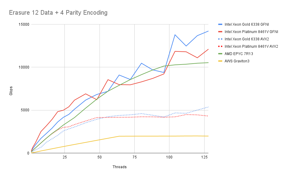 We are happy to see that Intel improved throughput on their latest platform. We look forward to testing the most recent AMD platform, and we expect its AVX512 and GFNI support to provide a further performance boost. Even if Graviton 3 turned out to be a bit behind, we don’t realistically see it becoming a significant bottleneck.