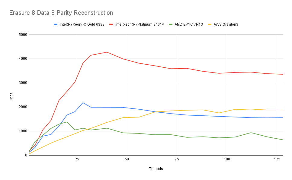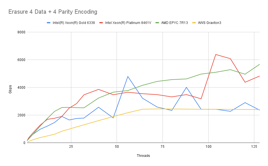 First of all, we observe that we very quickly get above the maximum NIC speed we can expect to encounter. This will, in practice, mean that CPU utilization from Erasure Coding will never consume more than a few cores on any setup.