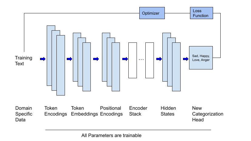 In this post, I am going to present fine-tuning. Like feature extraction, it is a technique that has been used before with deep neural networks. However, unlike feature extraction, this technique requires training. Let’s look at a specific scenario to see how fine-tuning works. Let’s say that you have an LLM that was trained on thousands of websites, thousands of books, and many textual datasets (like the Wikipedia dataset). This model would have a lot of general knowledge. An analogy would be that this model is similar to a smart colleague or friend who seems to know a little about a lot of different topics. Unfortunately, this model (and your friend) can not answer questions that require detailed knowledge about a specific topic. If you were to ask the model, “What should you do if you have a sore throat and your ears hurt? - then you would not get a good answer. To correct this, we can use fine-tuning. It works like this. Start with your original heavily trained model, and then train it some more using data that is specific to a particular domain. In our case, this could be a custom corpus of documents that talk about illnesses, their symptoms and treatments. This technique is especially valuable with models built using the transformer architecture as they are large and expensive to train. This process for transformers is visualized in the diagram below.